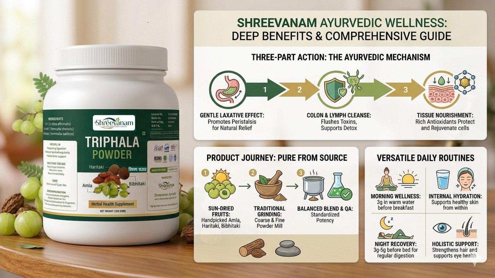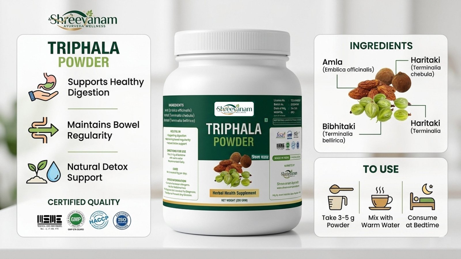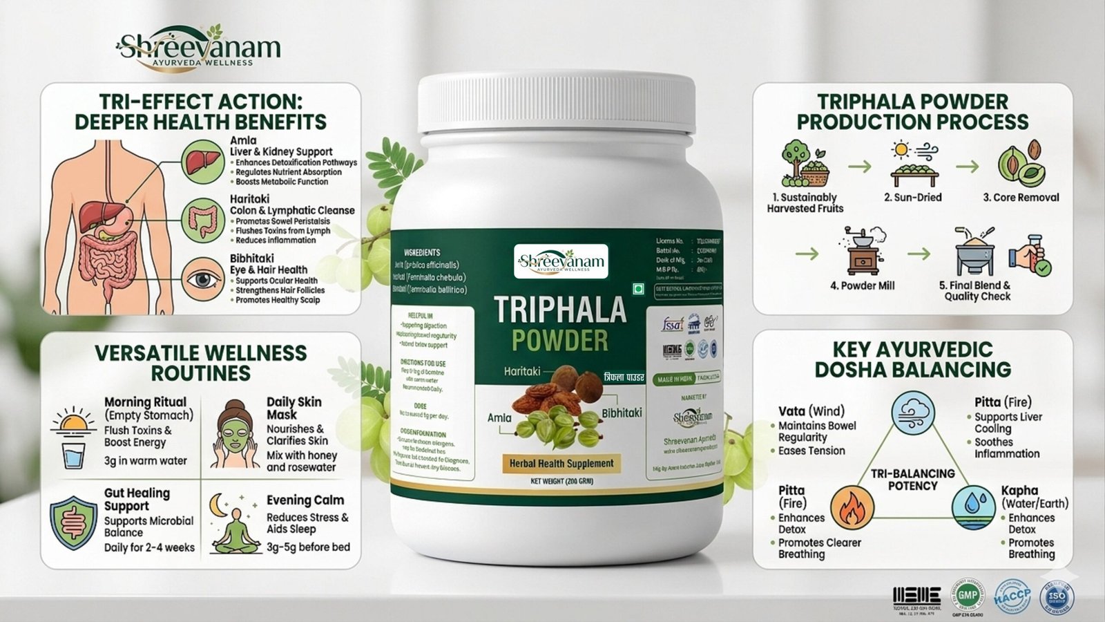 • ENHANCES GUT WELLNESS AND REGULARITY – Shreevanam Triphala Powder supports the gut by encouraging regular bowel movements and a balanced digestive system. It helps soothe digestive discomfort and promotes overall gut health, making it an essential choice for digestive wellness.